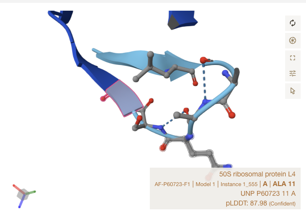 For rps4x 1-13 and rpl4-11, they were both on similar shaped sites as E Coli. I checked rpl4@283 because I saw in Alpha Fold that it was a ribbon section, near rpl4 1-11. I found it right nearby - right next to rpl4’s 1-11 site in the secondary structure diagram. The patterns are subtle, flowing but the back-and-forth twisting patterns, long sequences of nearly perfect matches.