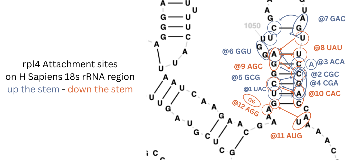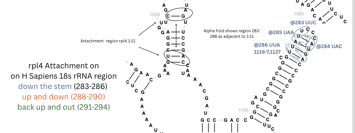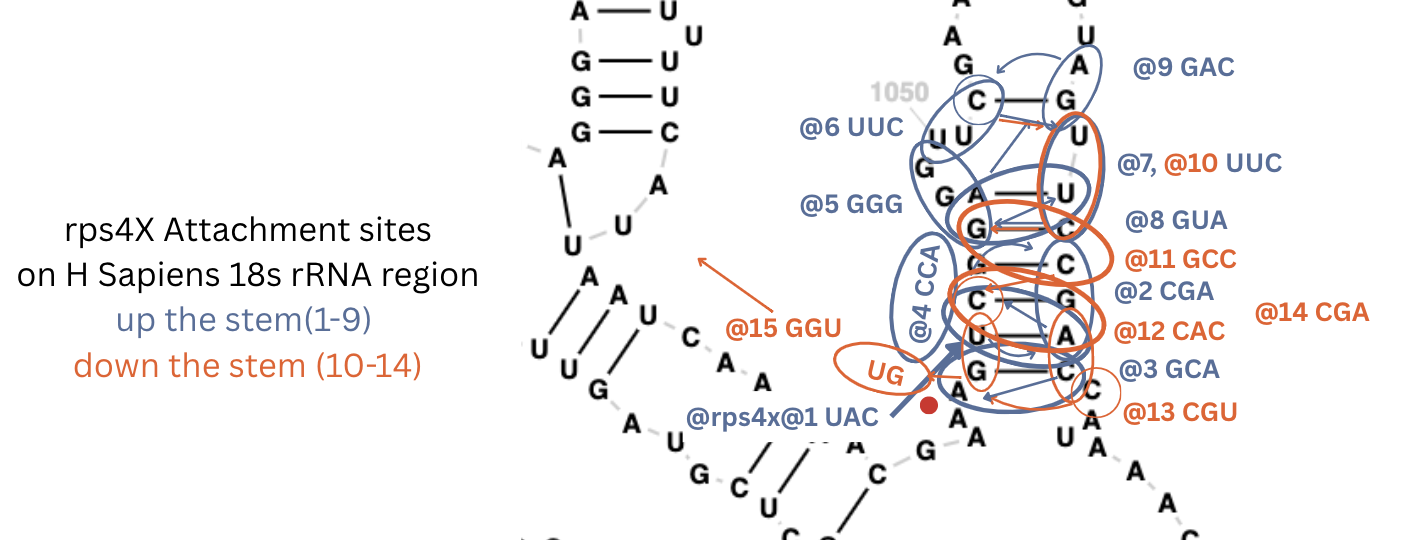 Then I found three more sites in the human rRNA 18s with the S4 encoding genes: rps4x and rpl4 genes matching sites similar to E Coli’s S4, but each was slightly longer.