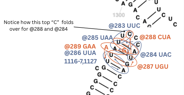 For the more complex human genome, so far I only looked for one gene - the one for S4 - rps4x and found it in about an hour on 18s. It’s the most complex attachment site yet with 9 codons going up the stem and five coming back down.