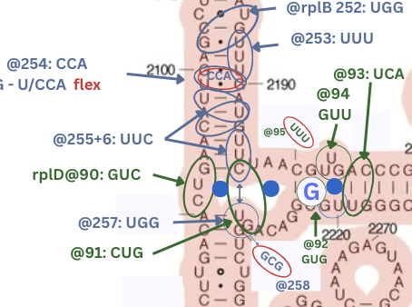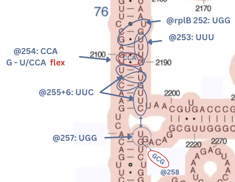 | rplB@254 | 2100,2099,2190 | mid-stem-flex | 23s V | CCA/GUUG | XwwW | ||