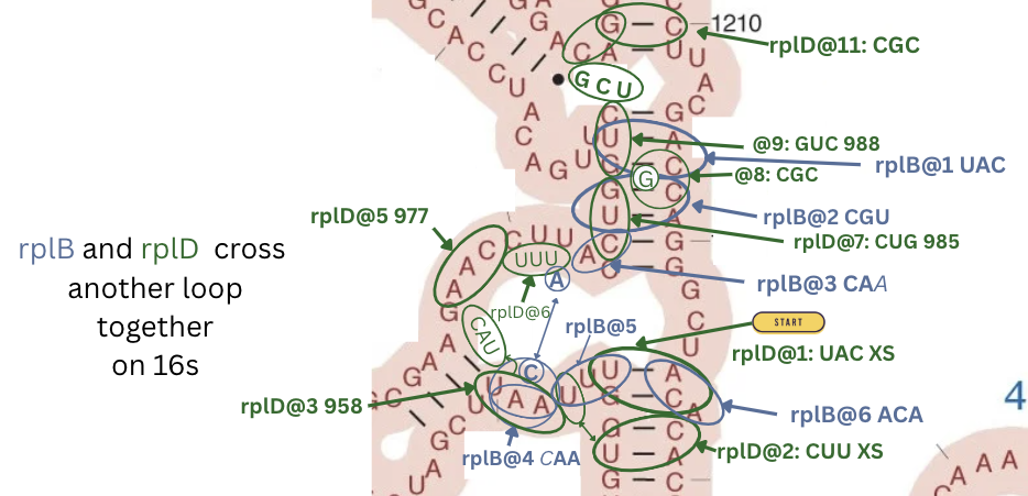 - rplB has the most beautiful sequence: two bonds on a long stem. In the middle of the stem the rRNA has: G - U and U - G - the weak opposites next to each other in symmetry, creating a more flexible part. Right in the middle of this long stem. On top of that comes the protein next has CCA - opposites to G and G but A and U are attracting.