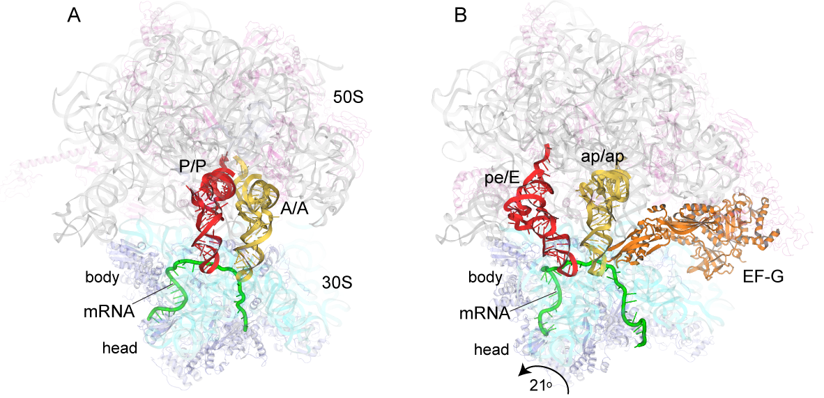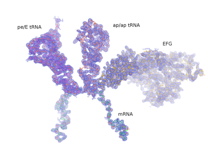 Here are some fantastic images from the Noller lab that show how tRNA goes through the three phases of assembly, by Jenner et al., 2010, Zhou et al., 2014: