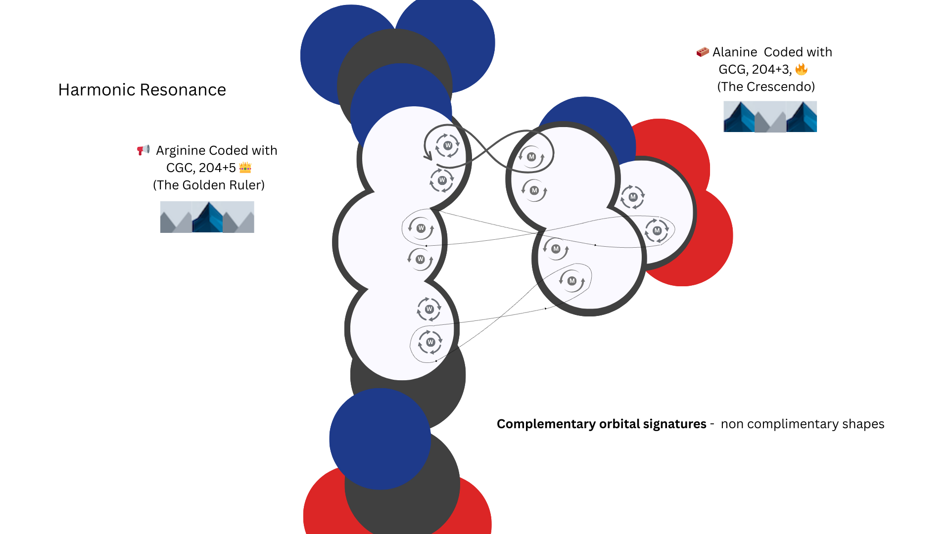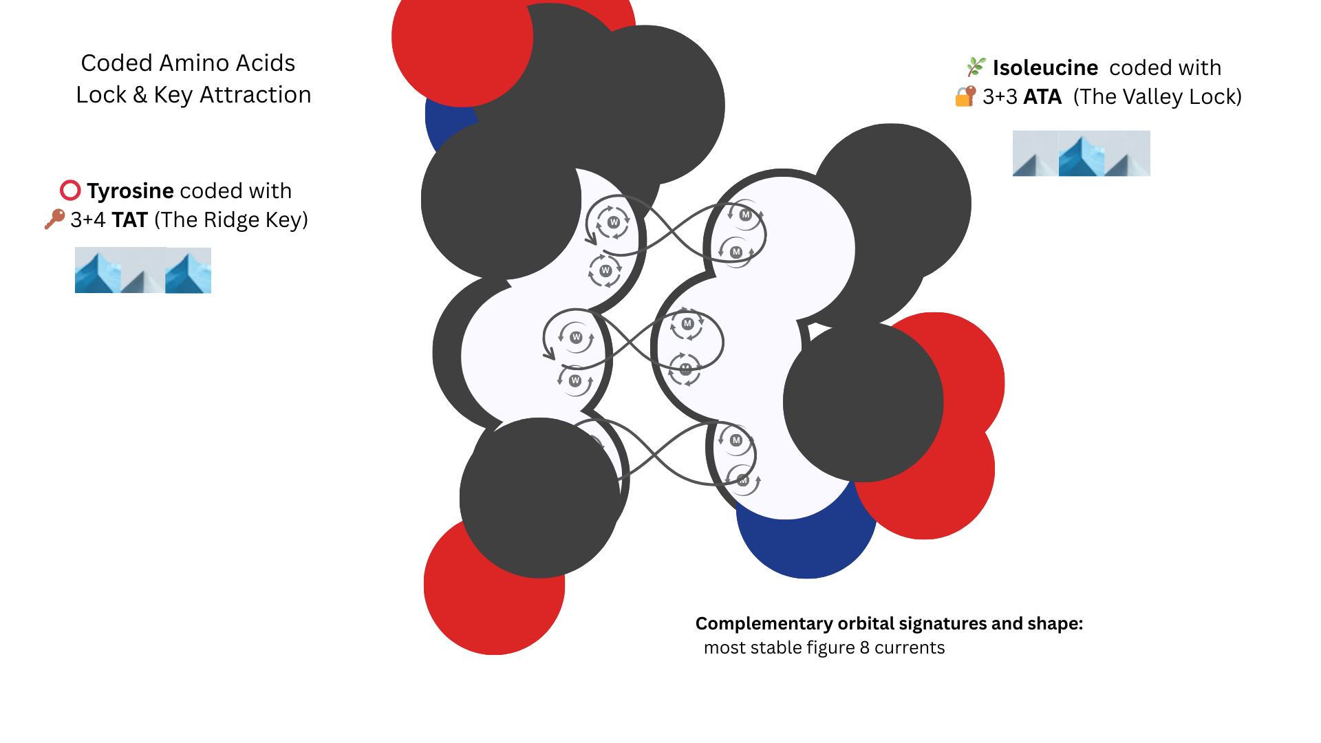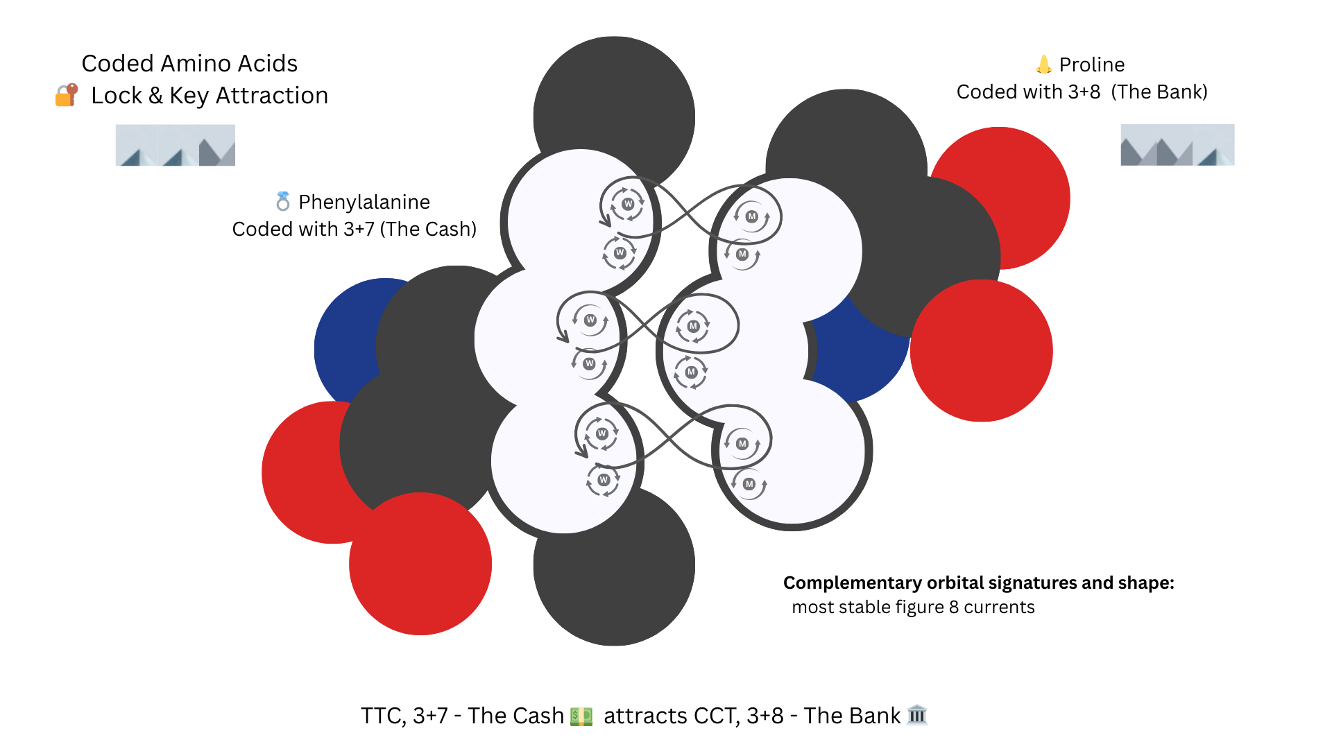 Since opposite patterns create figure 8 and attracting currents, TTCβs Phenylalaline and CCTβs Proline have opposite figure 8 flows that align with their natural geometry, you have a lock-and-key bonding pair. The nose of Proline fits into the ring of phenylalaline and the figure 8 currents hold it in place.