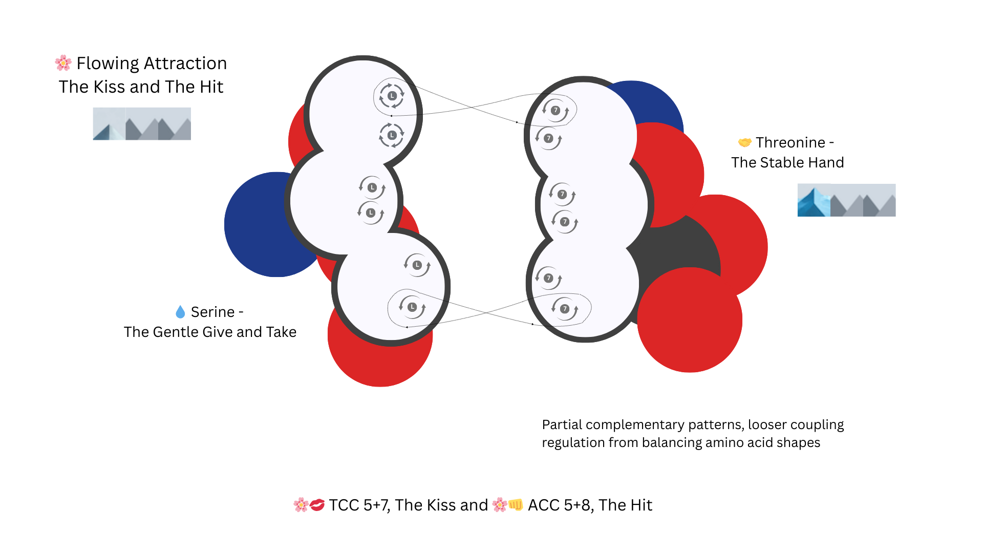 A Serine Amino Acid coded with TCC and a Threonine coded with ACC have the T to A attraction, the CC to CC repulsion and a flowing balance in the amino acid shape to create a bond that acts like a gate with one side taking the impact. These types of bonds create opening and closing tubes, ports etc.
