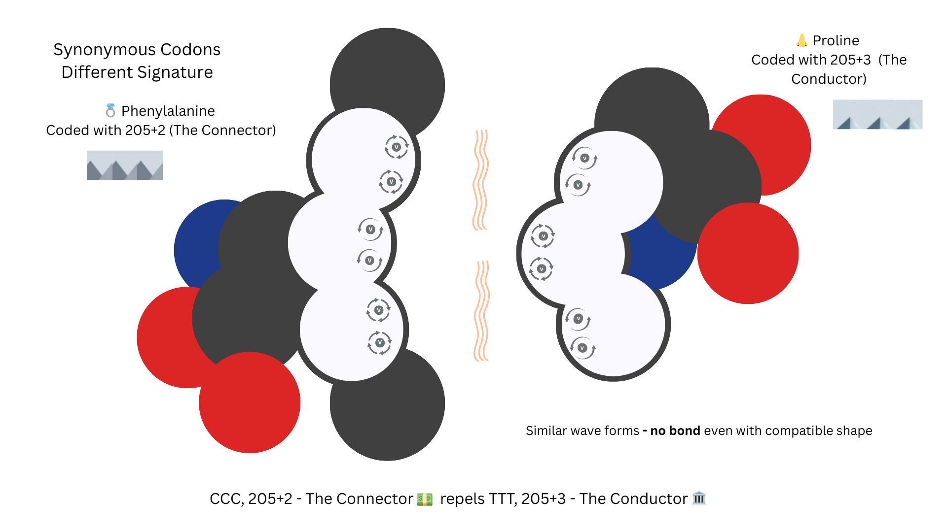 But a CCC coded Proline and a TTT coded Phenylalaline will be much less likely to bond, even with the same shape because their orbital signature patterns are too similar.