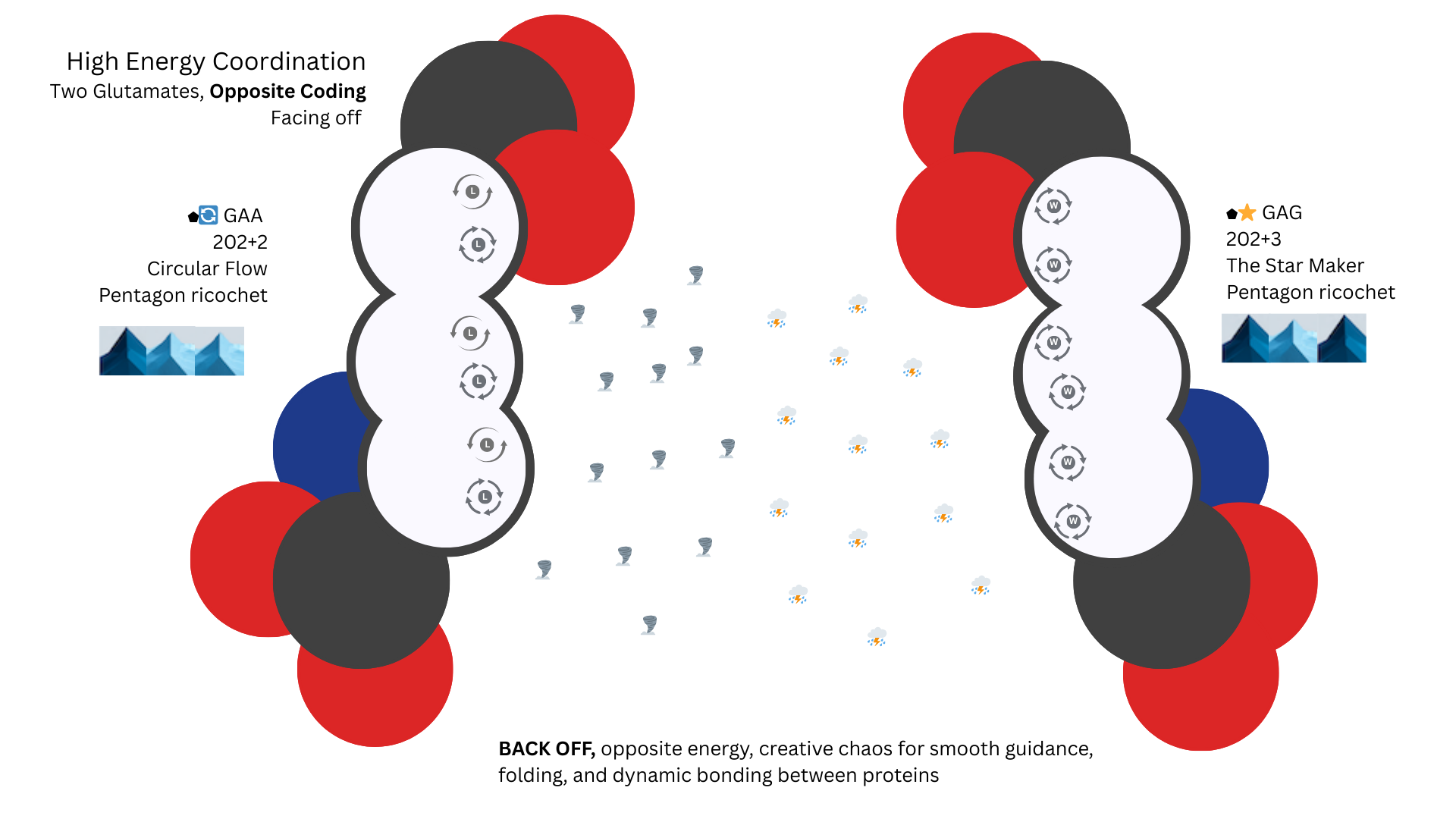 Two codons GAA and GAG both code for the same amino acid but with opposite patterns and opposite orbital signature energy. This is the ultimate high-energy repulsion.