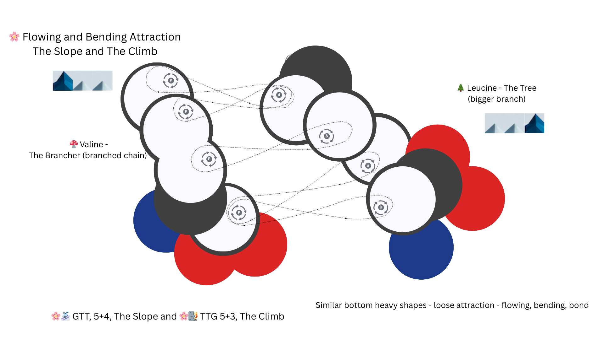 GTT and TTG code Valine and Leucine - both bottom heavy shapes bonded with a loose attraction creates a bending bond.