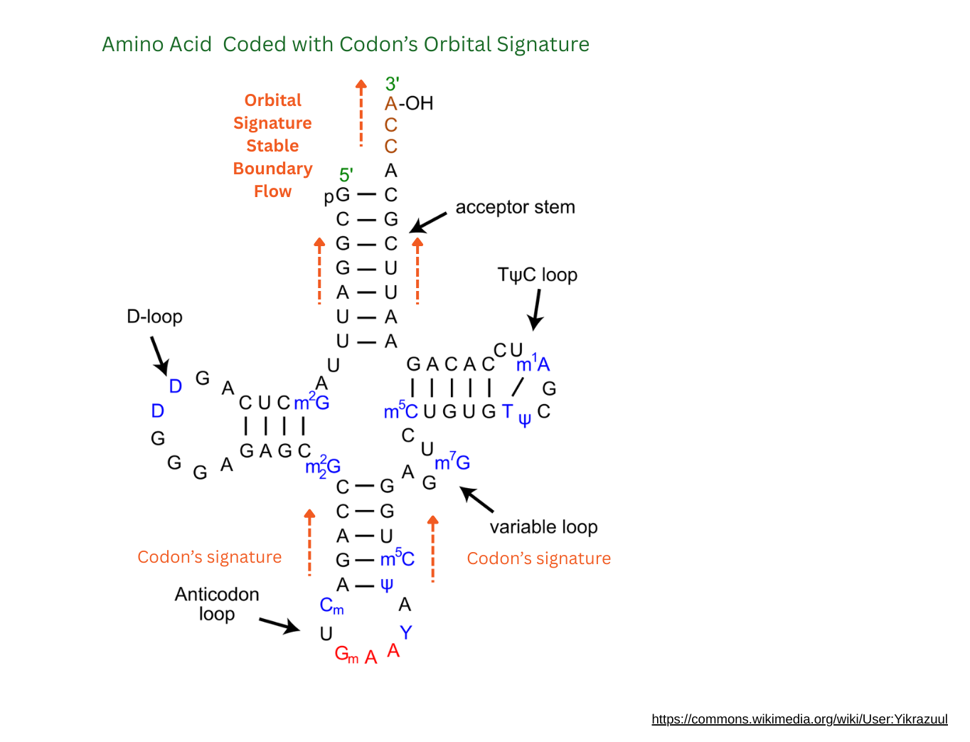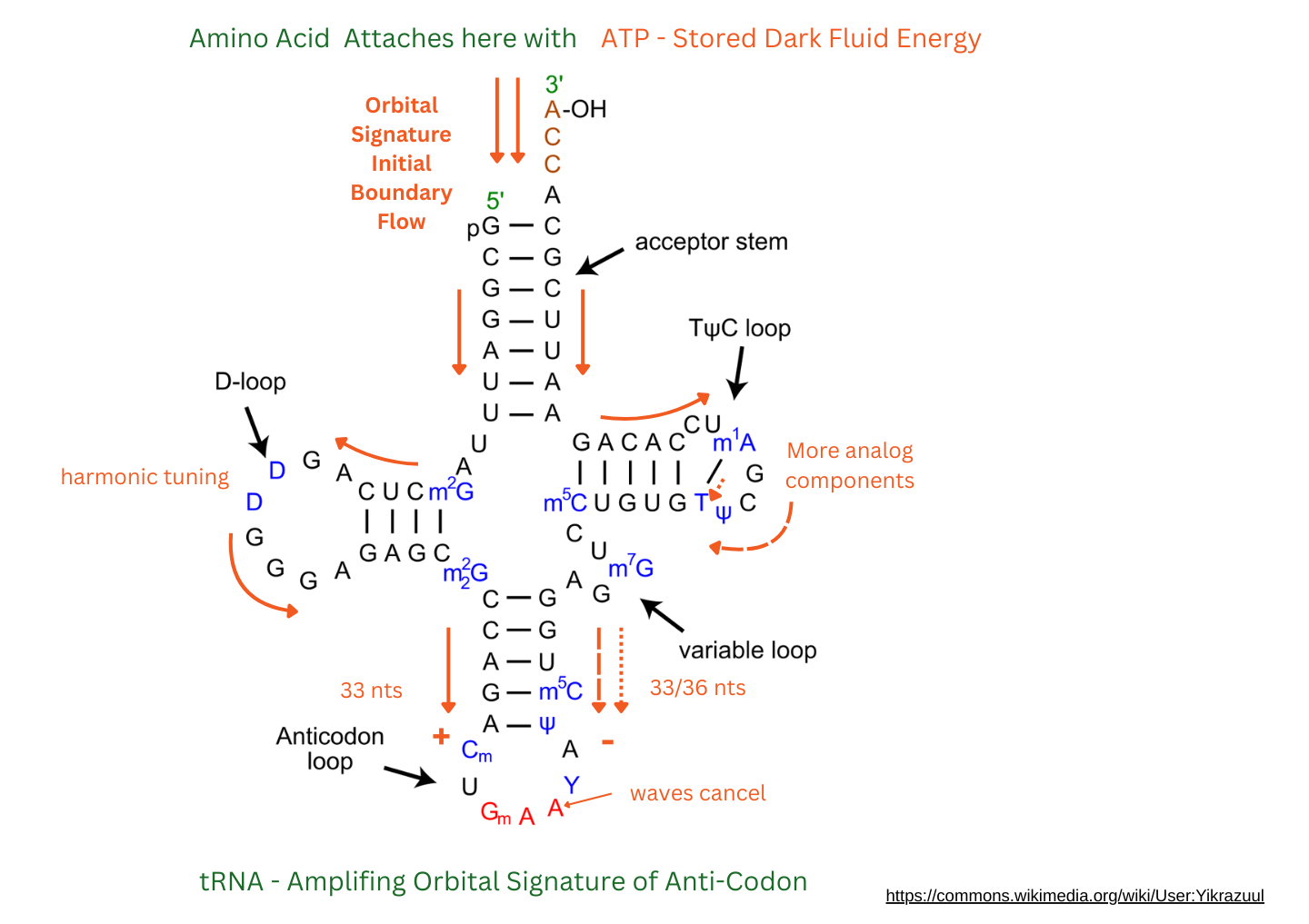 With dark fluid dynamics, Iβll show how the codonβs orbital signature is transferred to the amino acid using the tRNA. This magnetic fluid attraction affects how the amino acid bonds with both others and RNA nucleotides.